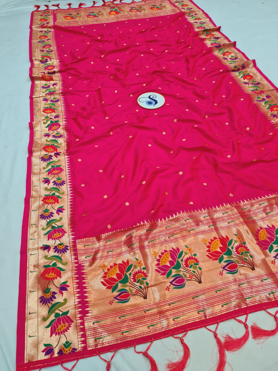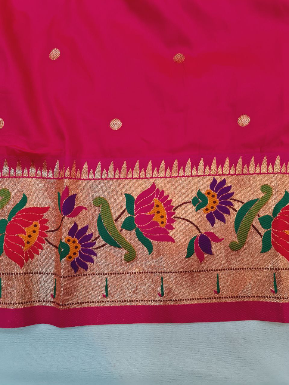Highlights: Intricate Zari Weaving, Semi Paithani Design with Lotus border