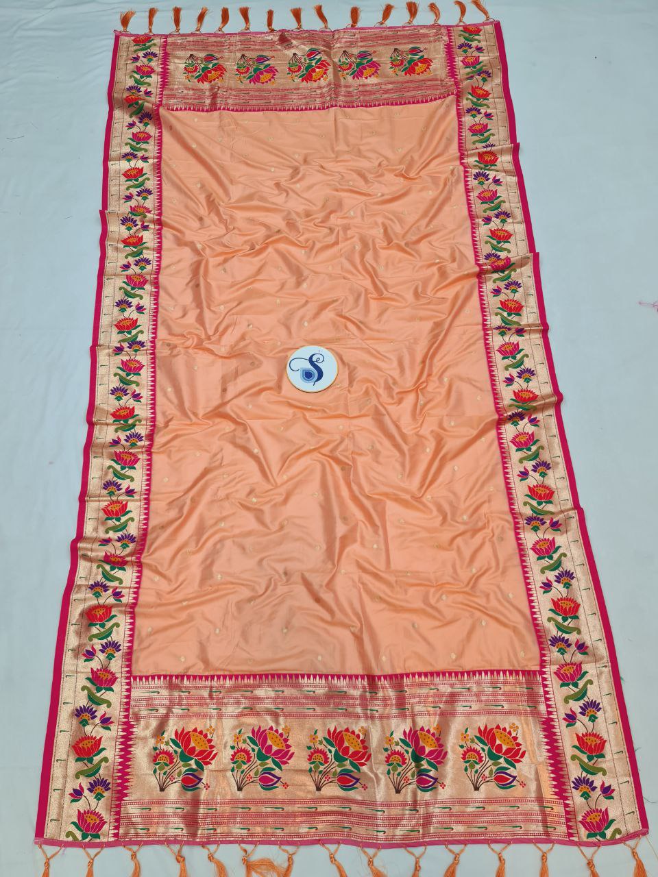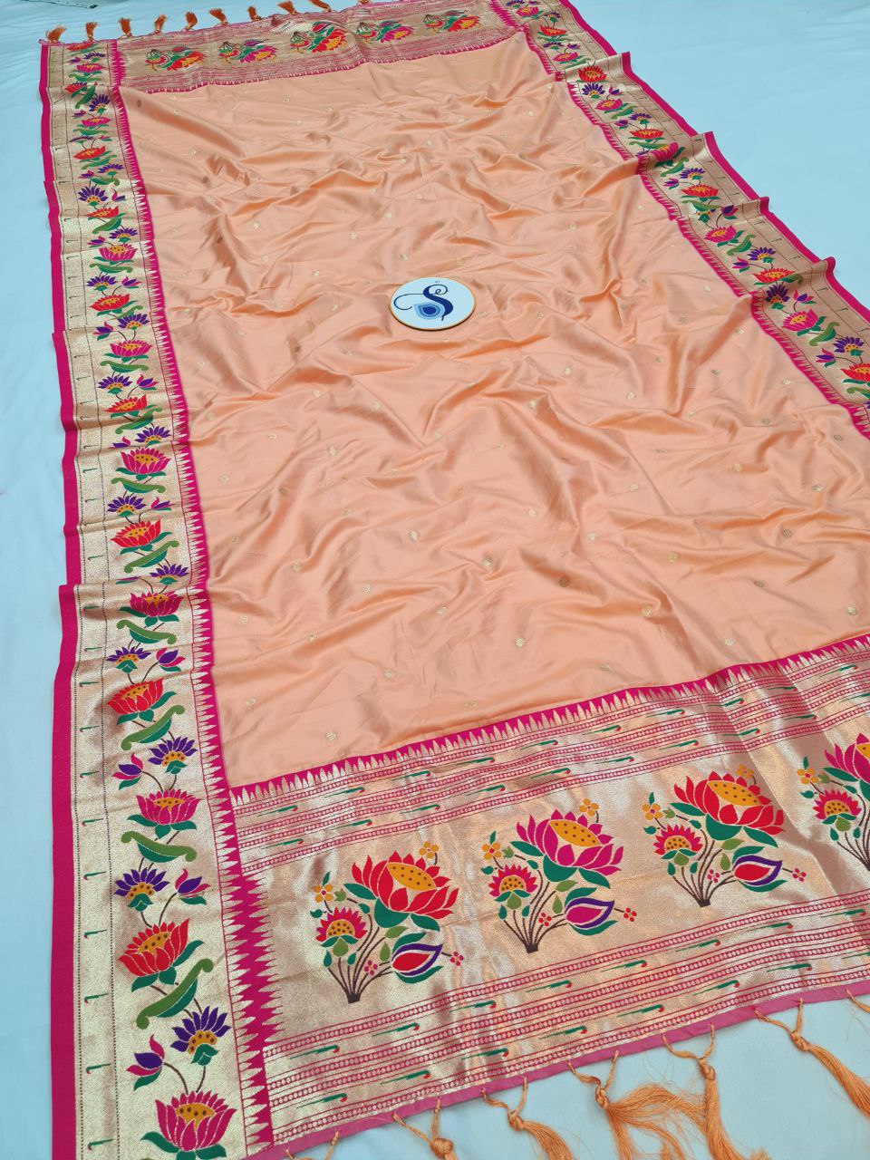 • Highlights: Intricate Zari Weaving, Semi Paithani Design with Lotus border