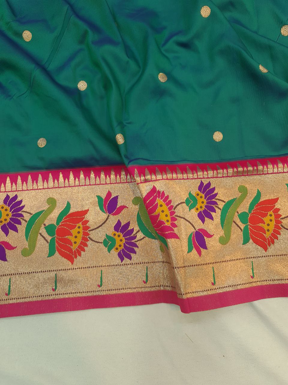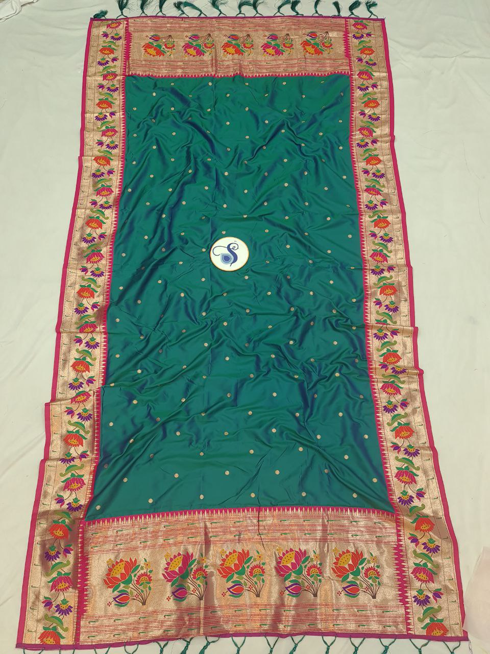 Highlights: Intricate Zari Weaving, Semi Paithani Design with Lotus border
