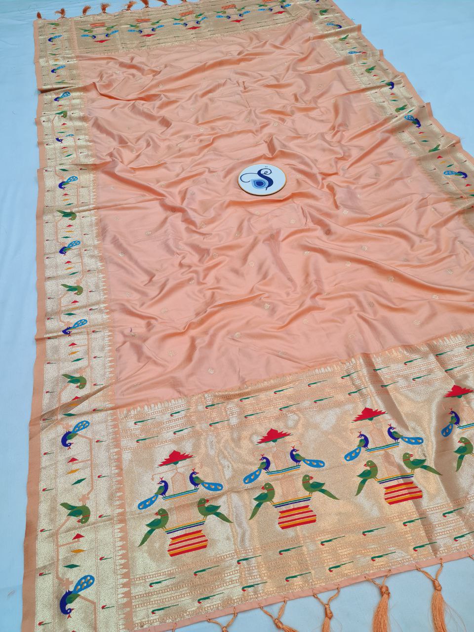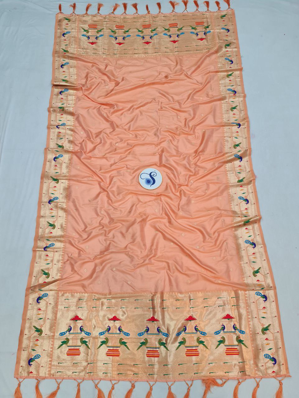 • Highlights: Intricate Zari Weaving, mor popat Paithani Design on border