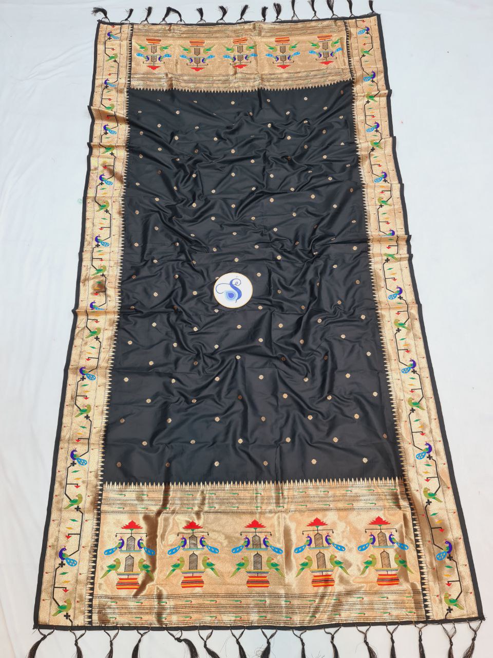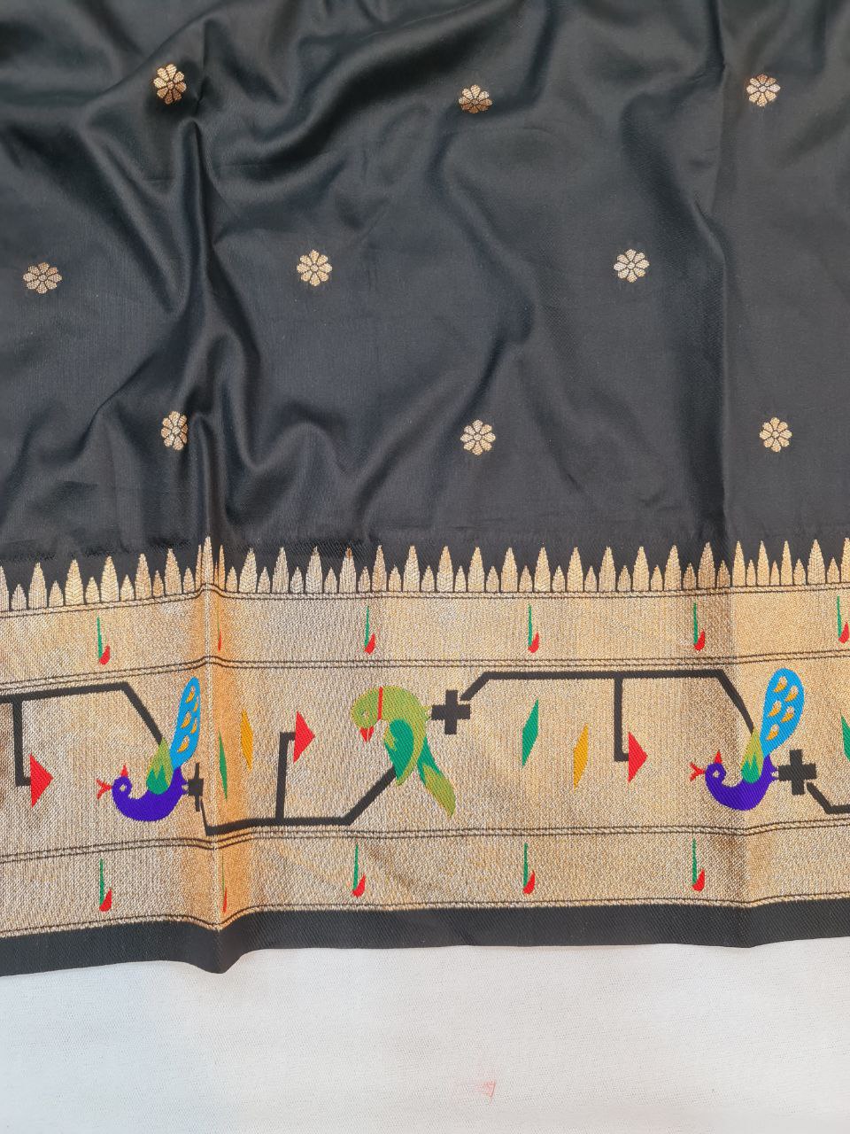 Highlights: Intricate Zari Weaving, mor popat Paithani Design on border