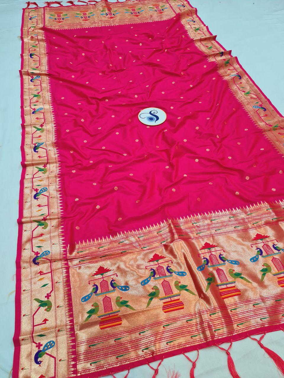 Highlights: Intricate Zari Weaving, mor popat Paithani Design on border