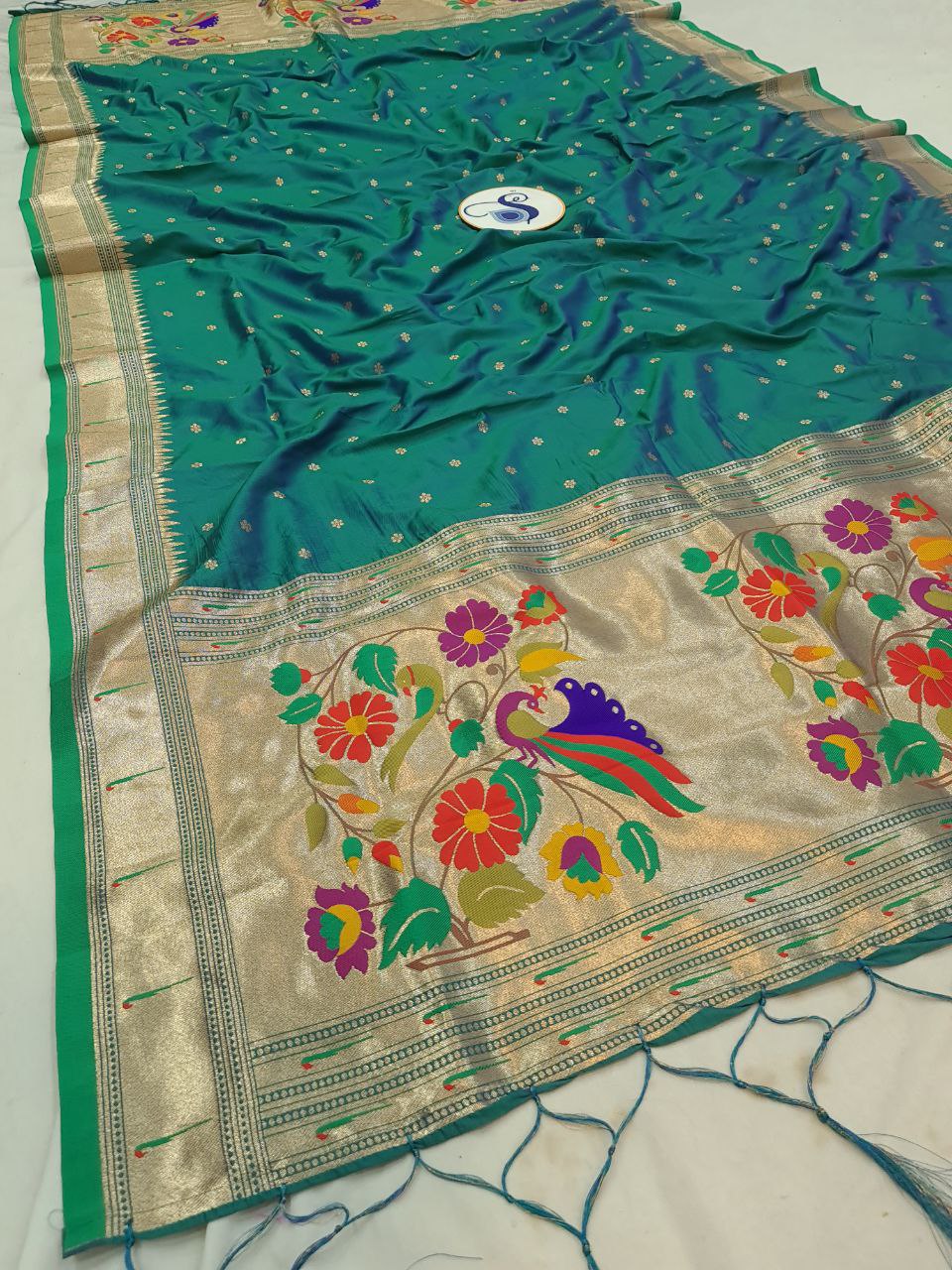 • Highlights: Intricate Zari Weaving, Semi Paithani Design