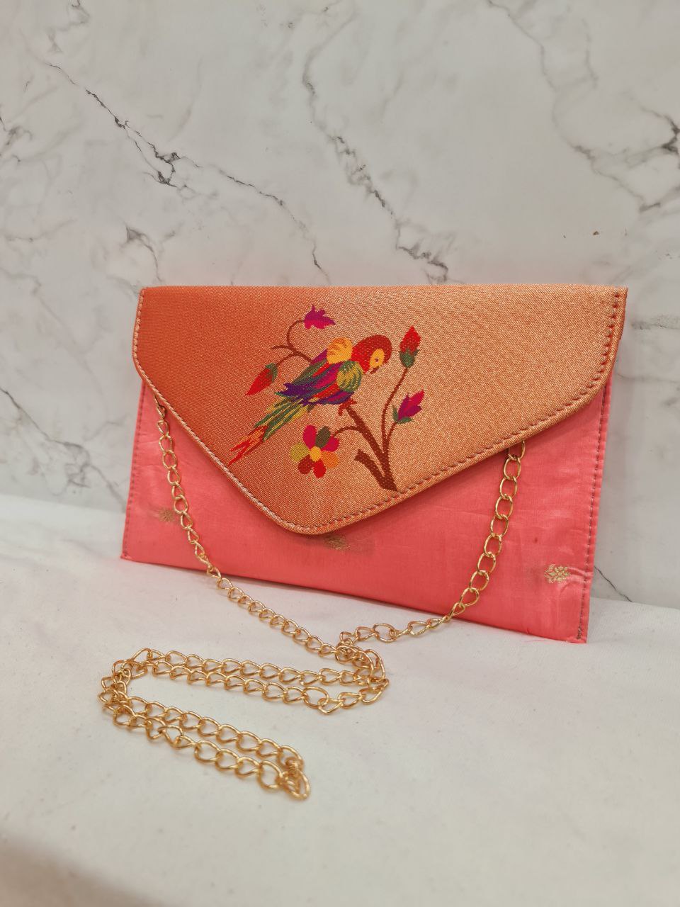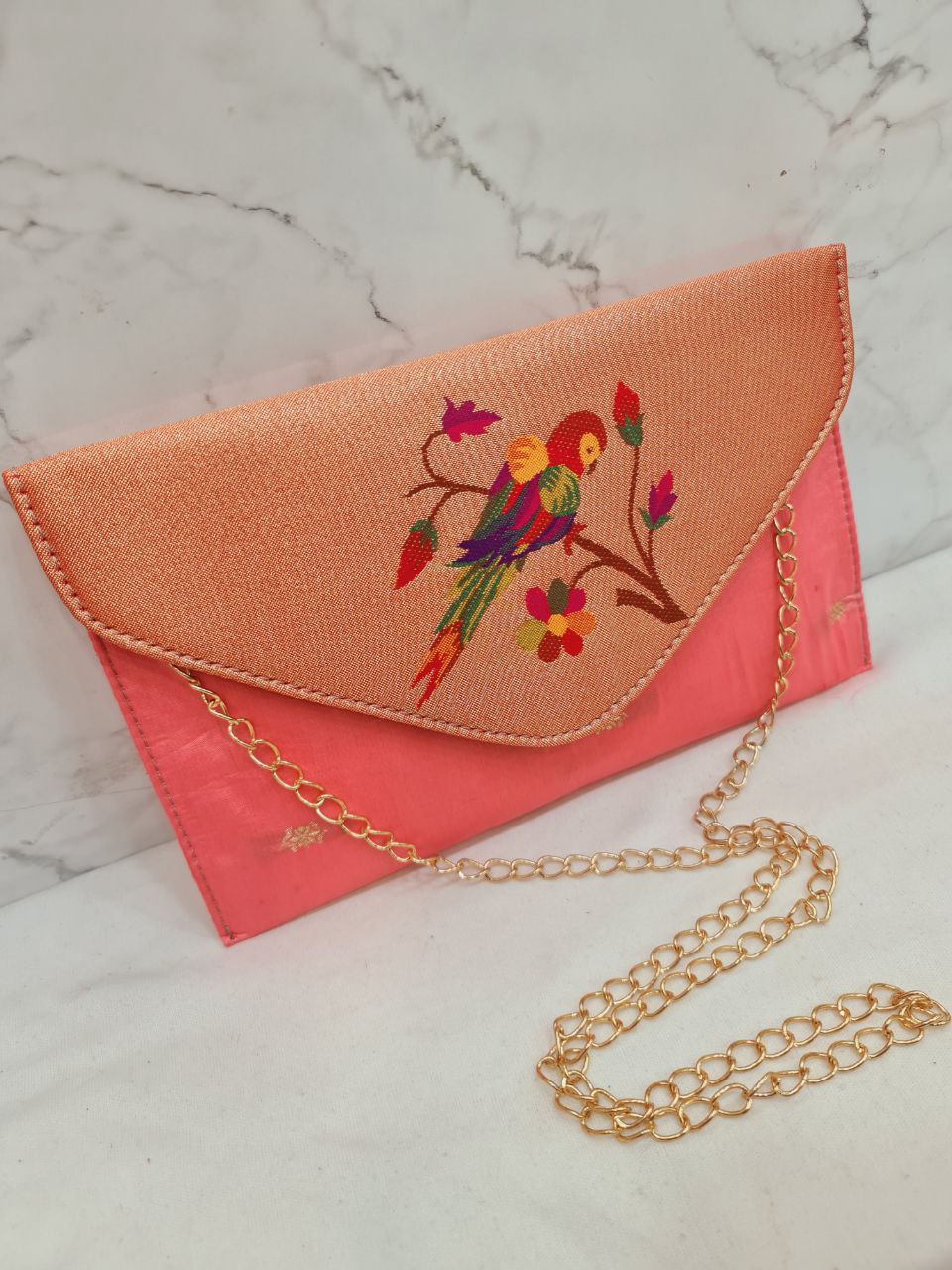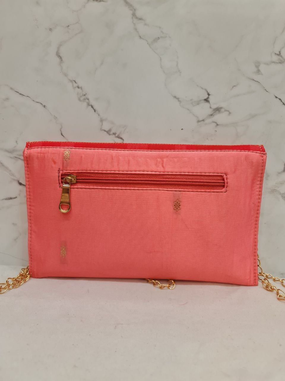 Important Note: All purses are made from all-over zari fabric, there may be some irregularity in the design and the design of the clutch/purse may not exactly match the picture provided on the website. position of the peacock and flowers may be different.